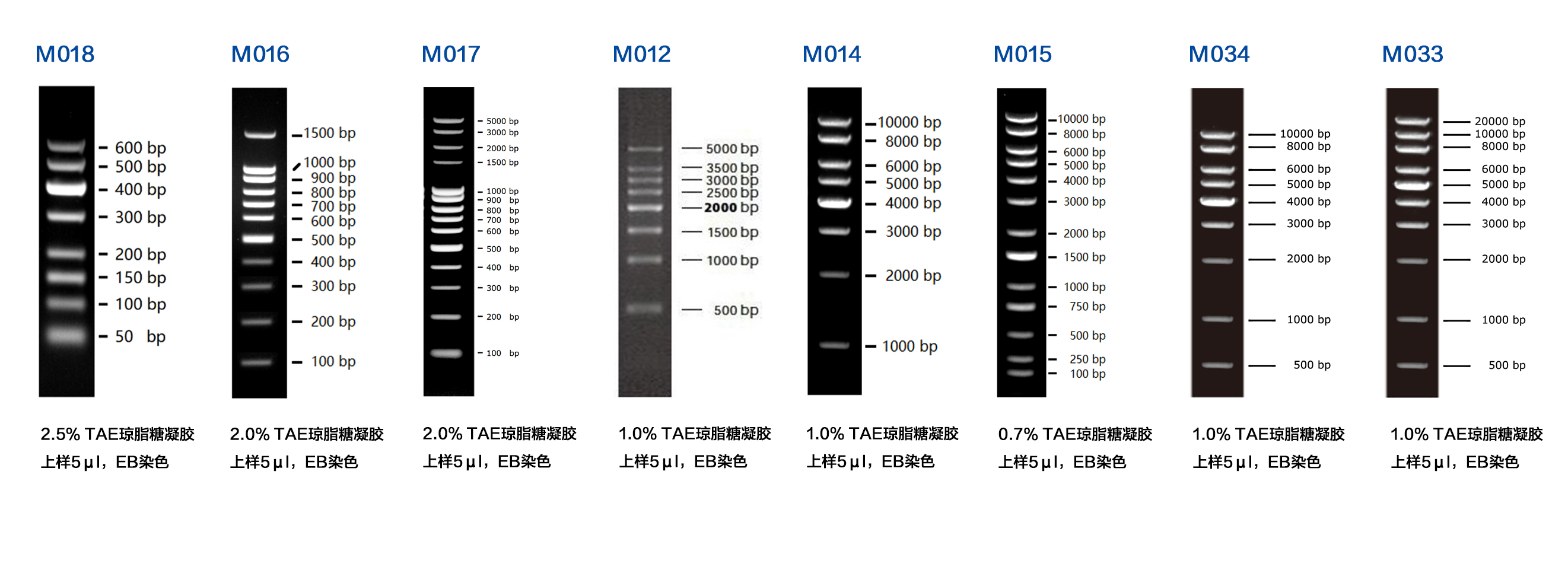 本產(chǎn)品為預(yù)混有 1x 上樣緩沖液的即用型 DNA 分子量標準,由 8 條線狀雙鏈 DNA 條帶組成,適用于對 1000-10000 bp 的雙鏈 DNA 分子大小的估算和粗略定量。本產(chǎn)品的 8 條帶分別為 1000、2000、3000、4000、5000、6000、8000 和 10000 bp。其中 4000 bp 條帶濃度最大,為 20 ng/µl,其余條帶濃度約為 10 ng/µl。