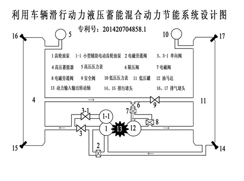 一、一種利用車輛滑行動(dòng)力液壓蓄能混合動(dòng)力節(jié)能系統(tǒng)工作原理 (專利號:201420704858.1)