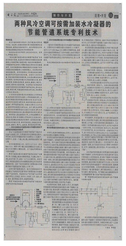 附件:1.《電子報(bào)》2013年10月20日刊發(fā)文章《兩種風(fēng)冷空調(diào)可按需加裝水冷凝器的節(jié)能管道系統(tǒng)專利技術(shù)》復(fù)印件