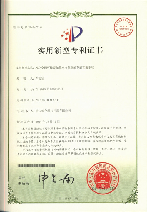 此專利技術(shù)由于在傳統(tǒng)風(fēng)冷空調(diào)中任意加裝水冷冷凝器節(jié)能管道系統(tǒng),因而適應(yīng)性強(qiáng),拆裝方便,可提高制冷制熱功率30%,同時(shí)降低工作電流30%左右。工作原理:通過風(fēng)冷冷凝及水冷冷凝形成雙級冷凝的冷凝結(jié)構(gòu),能有效解決傳統(tǒng)風(fēng)冷空調(diào)單一采用風(fēng)冷冷凝方式導(dǎo)致冷凝壓力高、制冷劑溫度高、壓縮機(jī)負(fù)荷較重、溫度高、磨損大、噪聲大、能耗高、制冷效率低的問題。