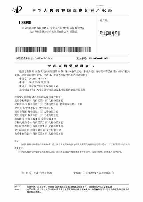 3. 風(fēng)冷空調(diào)可按需加裝水冷凝器的節(jié)能管道系統(tǒng)《專利申請受理通知書》(實(shí)用新型專利)復(fù)印件