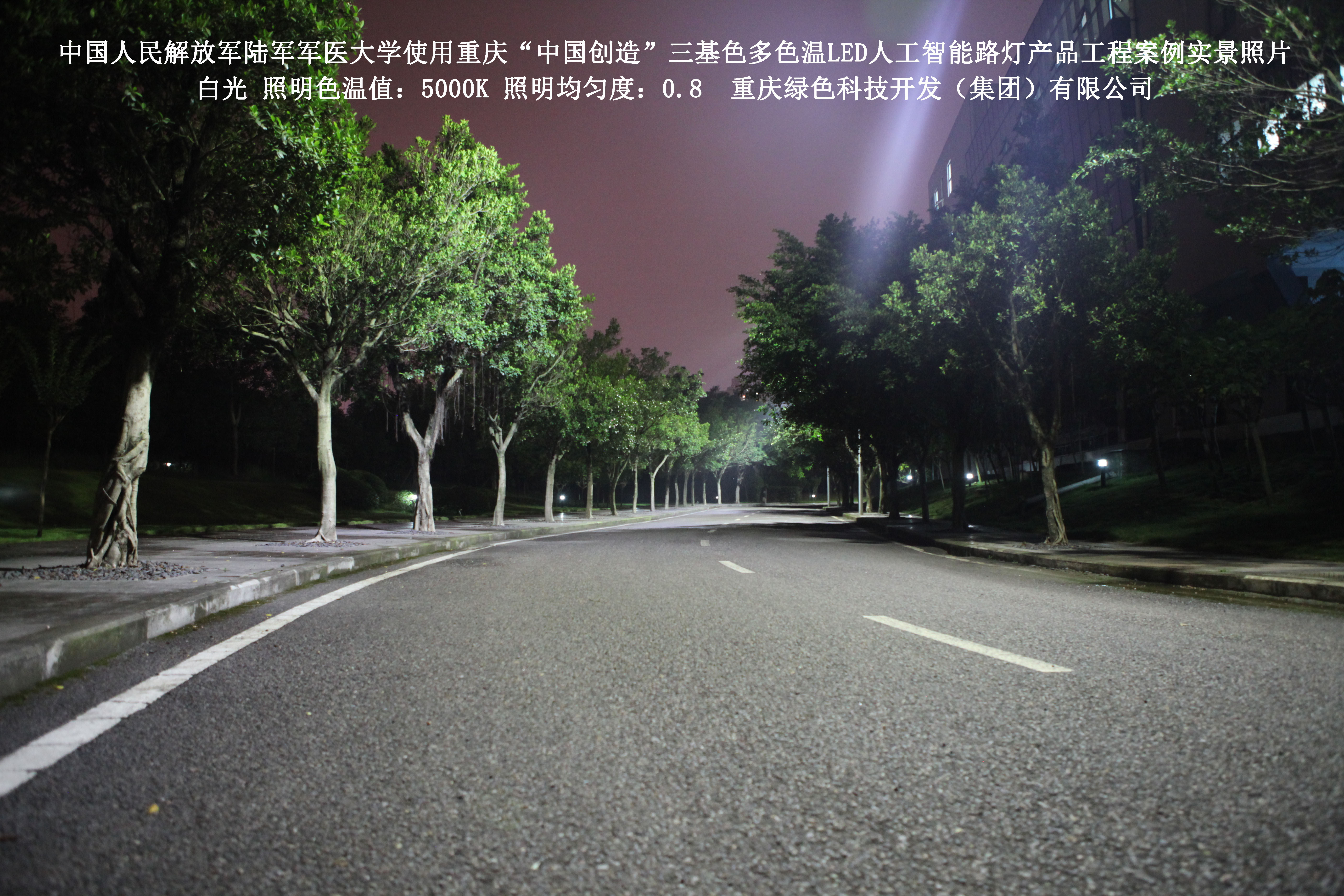 2018年4月,中國人民解放軍陸軍軍醫(yī)大學使用了我司研發(fā)制造的重慶“中國創(chuàng)造”三基色多色溫LED人工智能路燈,對沙坪壩大學城校區(qū)道路實施了綠色照明科技節(jié)能改造工程,該工程已全面竣工。工程實施后,極大地提高了照明清晰度、燈光均勻度、舒適度,實現(xiàn)城市路燈照明系統(tǒng)的智能化管理。