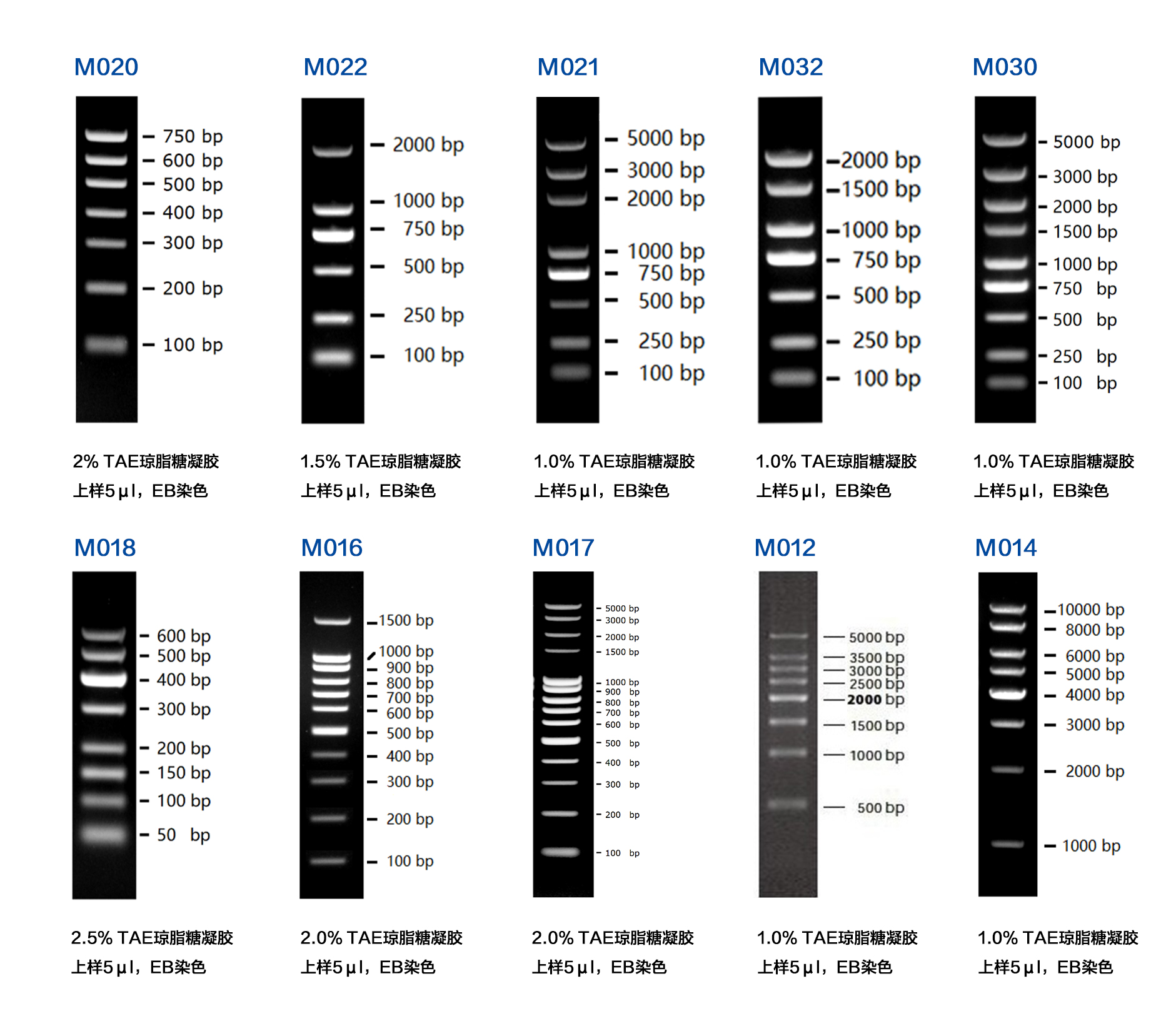 本產(chǎn)品為預(yù)混有 1x 上樣緩沖液的即用型 DNA 分子量標準,由 8 條線狀雙鏈 DNA 條帶組成,適用于對 50-600 bp 的雙鏈 DNA 分子大小的估算和粗略定量。本產(chǎn)品的 8 條帶分別為 50、100、150、200、300、400、500 和 600 bp。其中 400 bp 條帶濃度最大,為 10 ng/µl,其余條帶濃度約為 5 ng/µl。